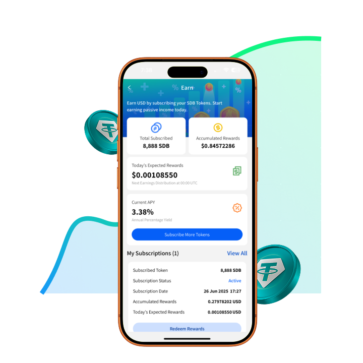 Turn SDB Tokens into a high-utility asset. By subscribing your holdings, you trigger daily USD incentives and capture the maximum APY generated by ecosystem growth.
